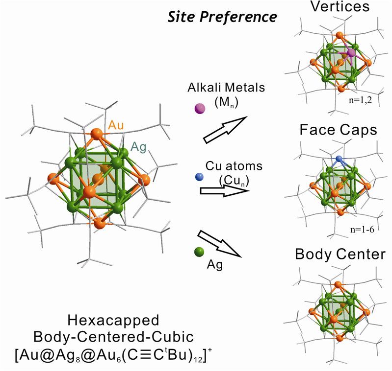 Yu Wang,§ Haifeng Su,§ Liting Ren,§ Sami Malola, Shuichao Lin, Boon K. Teo,* Hannu Hakkinen,* Nanfeng Zheng* "Site Preference in Multi-metallic Nanoclusters: Incorporation of alkali-metal ions or copper atoms into alkynyl-protected body-centered-cubic [Au7Ag8(CCtBu)12]+ cluster" Angew. Chem. Int. Ed. 2016, 55, 15152–15156. (§equal contribution) >> Fulltext Link